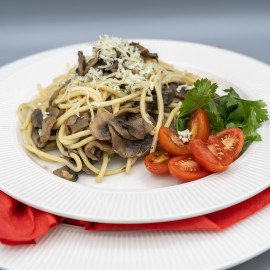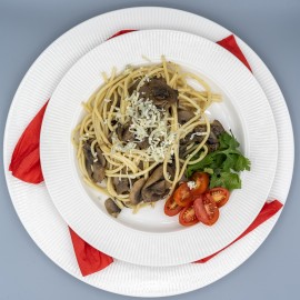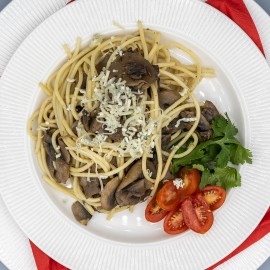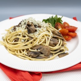Inspirace z Itálie, ale s českým srdcem. Naše špagety se žampiony jsou důkazem, že i bez masa může být jídlo poctivé, syté a plné chuti. Žampiony restujeme dozlatova, přidáme bylinky, česnek a na závěr posypeme strouhaným sýrem.